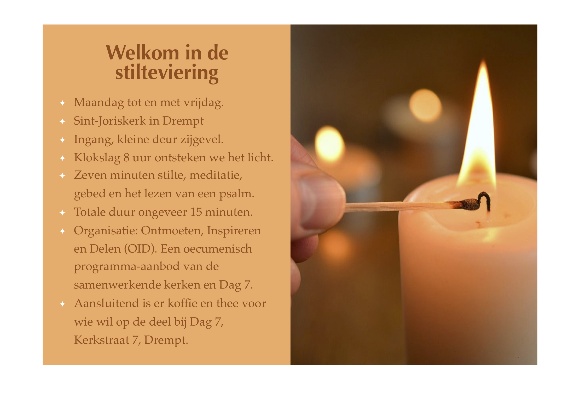 Elke werkdag om 8.00 uur welkom bij een korte stilteviering in de Joriskerk in Drempt. Samen steken we een kaars aan, luisteren naar een psalm of korte tekst en zijn stil. Wie wil kan een kaars aansteken en een eigen gedachte of wens meegeven. De viering duurt ongeveer 15 minuten. Daarna is er koffie en thee op de Deel van de boerderij. Rond half negen gaan we door met de rest van onze dag.